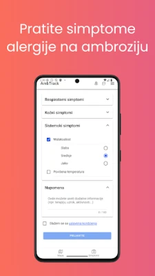 Алергията към амброзия може да бъде истинско предизвикателство за мнозина, нарушавайки ежедневието и качеството на живот. С AmbTrack, сега имате мощен съюзник в борбата с неприятните симптоми. Тази иновативна платформа събира на едно място силата на общността, за да създаде динамична карта на разпространението на амброзията. Вие активно участвате в процеса, отбелязвайки местоположенията на полените, докато едновременно с това следите собствените си алергични прояви в реално време през целия период на цъфтеж.