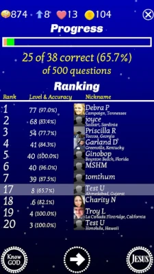 Независимо дали сте новопокръстен или дългогодишен вярващ, Jesus Bible Trivia Quiz Up Games е създадена да обогати вашето духовно пътуване. Можете да играете сами, за да усъвършенствате своите познания, или да се свържете с други потребители и да видите как се класирате в световната ранглиста, състезавайки се за най-високо ниво. Открийте безплатни категории като "Стар завет", "Нов завет", "Всичко е позволено", "Храна и напитки" и "Знамения и чудеса", докато напредвате и печелите златни монети за всеки верен и бърз отговор.