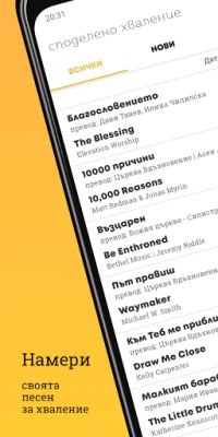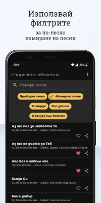 Намирането на любима песен никога не е било по-лесно. Интуитивната търсачка в „Споделено хваление", съчетана с мощни филтри като „Преводни песни", „Авторски песни", „С акорди", „Със записи" и „С връзки към YouTube", ви гарантира бърз и ефективен достъп до желаното съдържание. Създайте свой личен профил, за да получите възможност да допринасяте с нови авторски и преводни песни, да предлагате творби за превод и да съхранявате най-ценните си химни в персоналната секция „Любими".